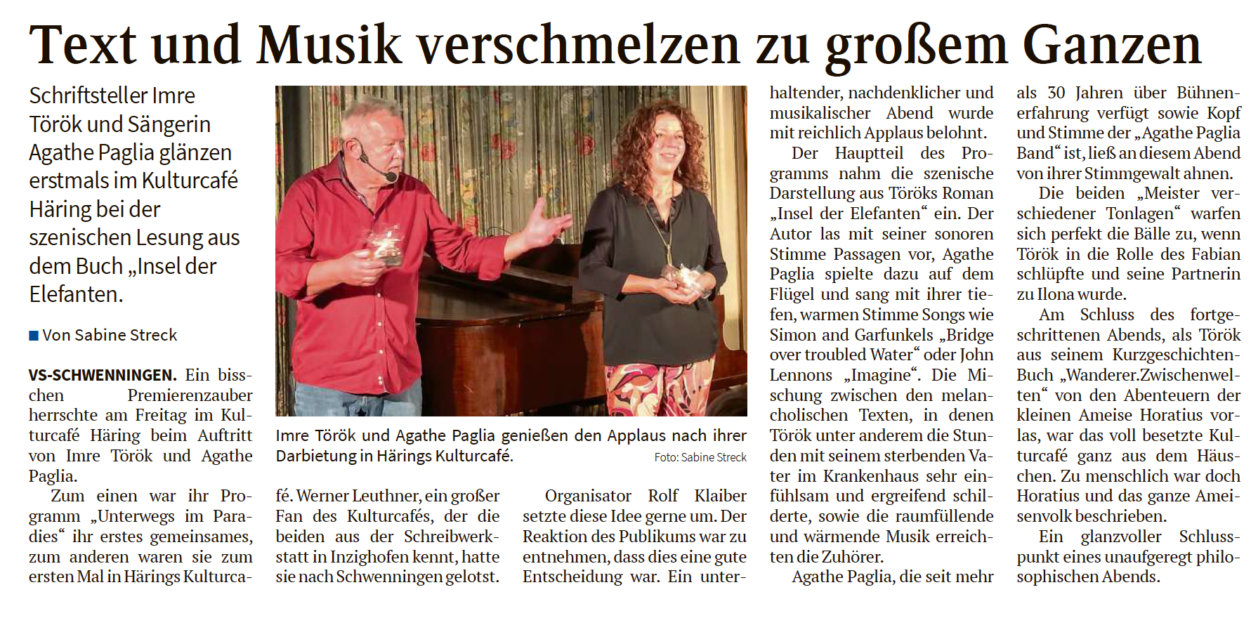 Imre Töröks Roman "Insel der Elefanten. Diesseits und jenseits der Erinnerungen" beginnt mit dem Kapitel "Ins Paradies". Paradiesisch bleibt es höchstens, wenn Agathe Paglia mit ihrem charismatischen Gesang Songs zum Ausdruck bringt, die im Roman notgedrungen ein leises Dasein führen. So entstand die Idee der Musikerin, sie zu verstärken und auf die Bühne zu bringen.